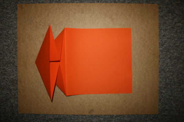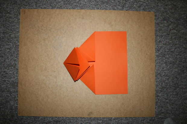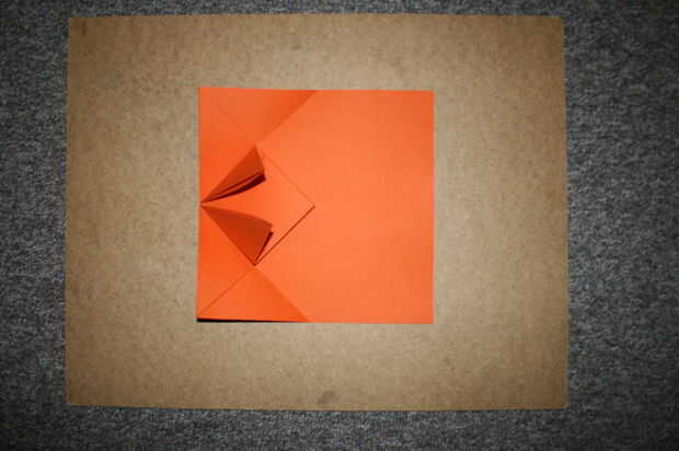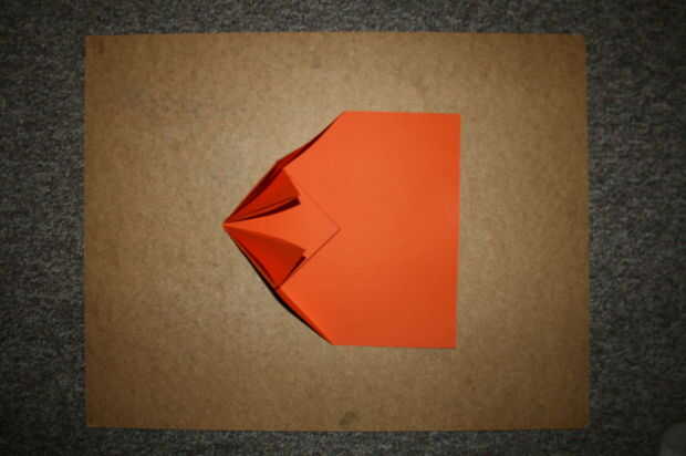6) 1.6) invertir el pliegue que acaba de hacer en las esquinas traseras, por lo que se encuentran por debajo y adentro, haciendo que la parte superior puntiaguda otra vez.