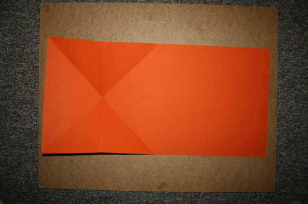 2) 1.2) en un extremo, doblar cada esquina hasta el borde opuesto para hacer dos 45o pliegues y luego desplegar, para hacer un pliegue de X. Vuelta y doblar el borde superior hacia abajo para biseca la X.