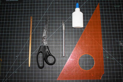Para este proyecto necesitarás algunas herramientas, es decir, una tijeras, navaja, regla y pegamento. Además a menudo utilizar un viejo palillo para ayudar a empujar el papel cuando sea necesario y presione las lengüetas. También una alfombra de "auto sanación" salvará a su mesa, pero no es necesaria.