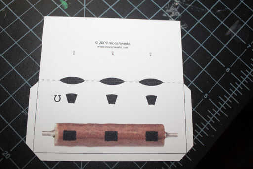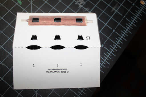Después de imprimir el .pdf cortar las piezas individuales. Primero cortar el cuerpo principal de la calculadora de resistencia, luego cortar las formas negras. Después suavemente anoto (con el final mate de la navaja) las líneas que denotan las aletas y la línea de puntos que muestra cómo plegar el cuerpo principal. Este paso es muy fácil llegar bien crujientes pliegues.