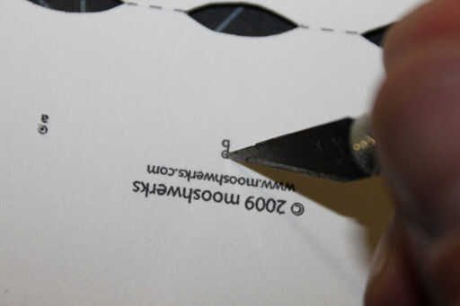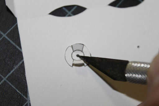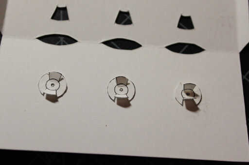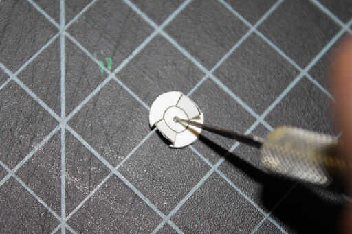 Este paso puede ser el más quisquilloso, pero creo que he subido con una manera de asegurar la suficiente precisión. En primer lugar, en el cuerpo, hágale un agujero con el cuchillo de la maquinilla de afeitar a través de cada uno de los puntos marcados "a", "b" y "c". Asimismo, haga un orificio a través del centro de un eje. Mientras se mantiene las pestañas de agregar un poco de pegamento a la parte de atrás de un árbol. Luego, con la punta de la navaja a través del agujero que acaba de crear, montar el eje del cuerpo principal alineando los agujeros. Quizás desee experimentar con la alineación de la ficha en tu calculadora, pero he encontrado la operación para trabajar un poco más suavemente si las pestañas se pegan verticalmente con respecto al cuerpo principal.