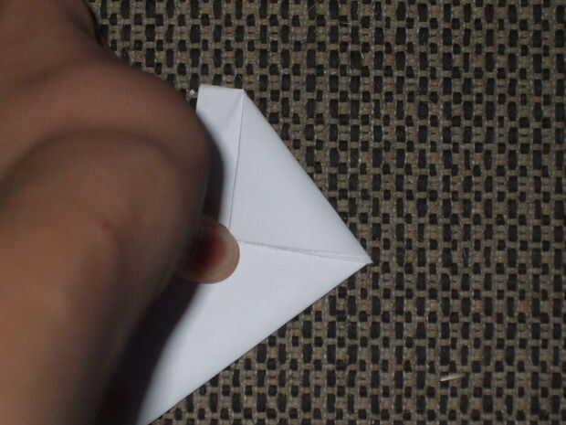 Ahora, comienza a tener complicado.  Tomar la esquina superior derecha de la solapa y doble hacia abajo por lo que debe tener este aspecto.  Después hazlo hacia el otro lado.