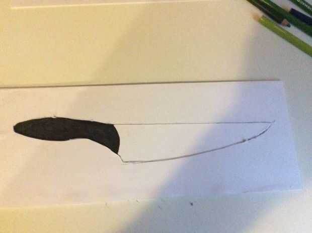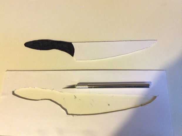 Después de la hoja reforzada se ha secado completamente puede dibujar la forma de su cuchillo directamente en la hoja, si no desea imprimir sólo una imagen de un cuchillo de cocina típica y trazar sobre la hoja. Después de haber hecho esto empezar a cortar la forma con el cuchillo del exacto trazando las líneas con él. Esto podría tomar algún tiempo, sea paciente y amable.