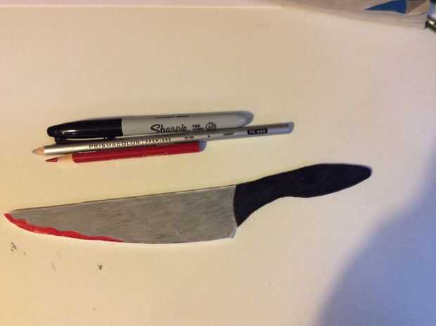 Ahora usted está listo para colorear y personalizar su cuchillo con pintura, lápices y marcadores. Me fui para la mirada de un cuchillo de cocina simple con una pequeña cantidad de sangre en el extremo, pero no dude en ser tan creativos como sea posible con su cuchillo. Esta técnica también funciona para las formas de cuchillos diferentes para diferentes apoyos. Tener diversión y Feliz Halloween.