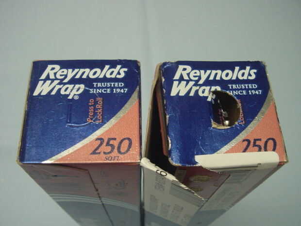 Mi más reciente uno fue descubriendo que cajas de papel de aluminio Reynolds tienen lengüetas en los extremos de la caja. Después de iniciar el rollo, que pulse en las pestañas para mantener el rodillo en la caja como usted tire de la lámina. Curiosamente, Reynolds pergamino y papel de cera Cut-Rite de Reynolds no tiene pestañas.