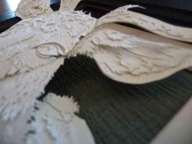 Con el tablero de lámina perimétrica y x-acto, empezar a cortar las formas que fueron transferidas en el papel. Porque las formas son complejas pueden llevar tiempo para cortar. Tómese su tiempo para cortar cada forma lentamente. Al intentar cortar rápidamente, usted puede accidentalmente cortar una pieza de la forma. Una vez que ha cortado varias capas y comenzar a pegar cada uno de ellos sobre el otro, no pegar toda la pieza. Antes de pegar, doblar la forma un poco para que se vea más dinámica y poner pequeños trozos de pegamento en las áreas que se unirá a la capa más baja. Si nos fijamos en la segunda foto de la cara de los ciervos, puede ver que las capas en la parte superior son todos ligeramente dobladas para crear la apariencia de 3D. Perdón por la falta de cuadros. La corte tomó varios días y me doy cuenta que no tomo ninguna foto durante esos días.