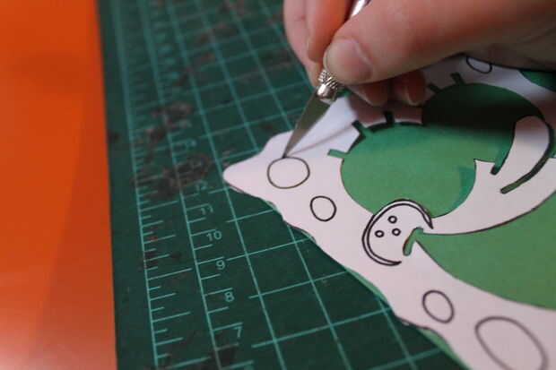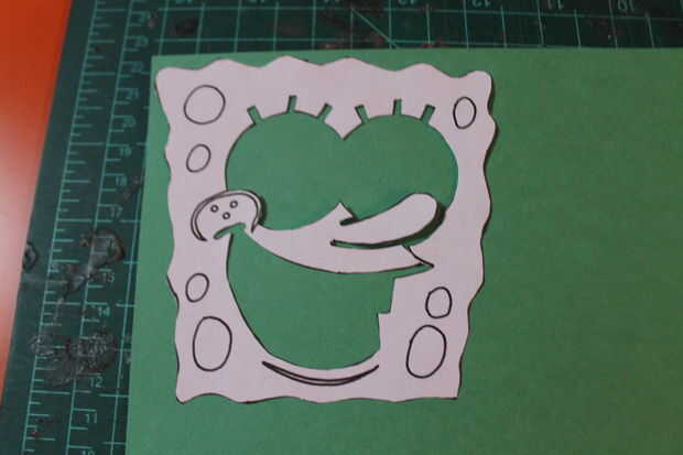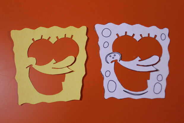 Si tienes cualquier forma que se consideraría una superposición de color, no corte los orificios para ellos. Cuando usted corta a las formas, que se pega encima de los bloques de color lo rodean. Por ejemplo, los agujeros verdosos en Bob esponja se le pega directamente sobre el bloque amarillo de color.