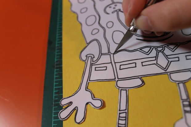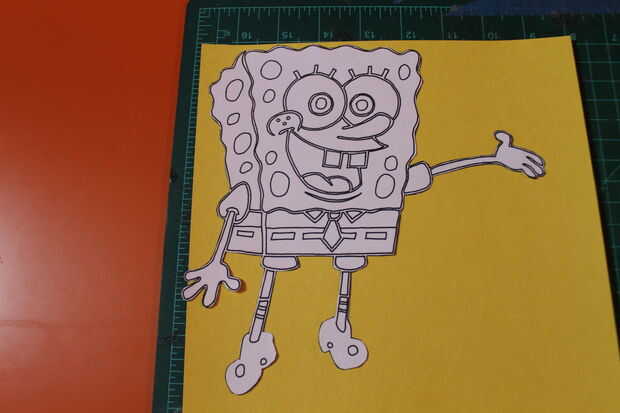 A continuación tienes que empezar a cortar los bloques de color. Considero que un bloque de color que cualquier cosa rodeada por un contorno negro. Para cortar un bloque de color, seleccione una hoja de papel de construcción más cercana en el color la forma que intenta cortar. Coloque su hoja de papel encima de la almohadilla de corte y debajo de la plantilla y cortar la forma. Si hay formas dentro de su bloque de color con un contorno negro, corte los así. Por ejemplo, cuando para colorear de Bob esponja en color amarillo en la parte delantera, tuve que cortar el agujero para la boca y los ojos.
