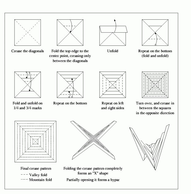 para aprender a doblar un paraboloide hiperbólico. El enlace es de la Página Web de Erik Demaine. Si desea más información acerca de las matemáticas detrás de esta estructura, revisa esta Página.