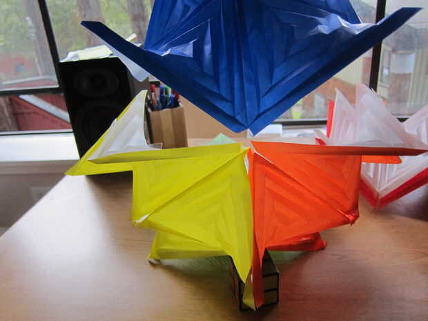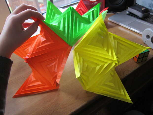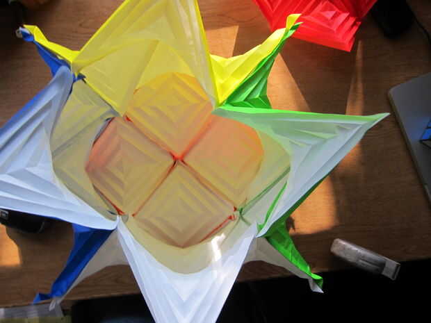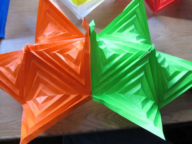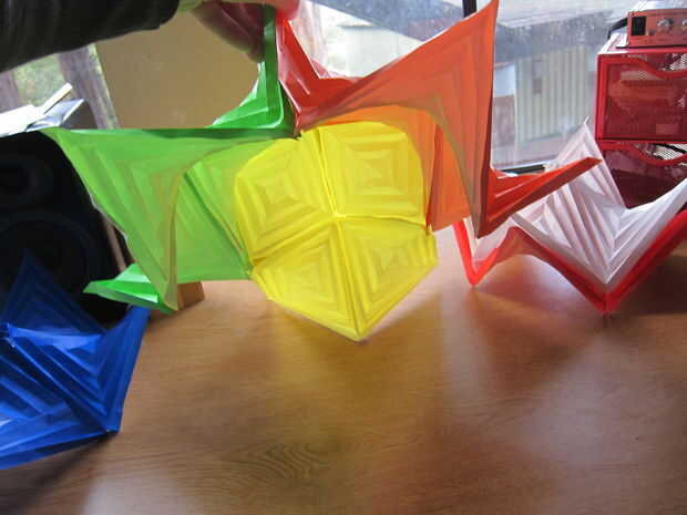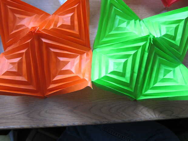 conecté 14 cubos juntos para crear la cadena de cubos arco iris vista por encima. Tomó 168 hojas de papel.Usted puede hacer un cubo abierto propio usando solo 12 hojas de papel y algunos dobleces simples. Estos cubos abiertos son bastante divertido y