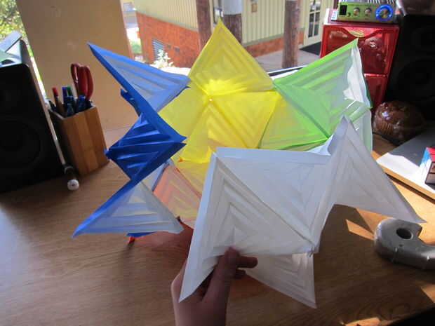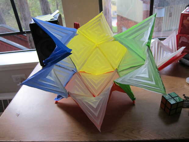 Como el resto de este proyecto, adjuntando los lados es más repetitivo que difícil. Es un proceso, y tienes que ser un poco delicado como la estructura será bastante floja hasta el lado final es pegar con cinta adhesiva. Únalos con cinta adhesiva los bordes de los lados del mismo modo que con cinta los bordes de los paraboloides hiperbólicos sola.