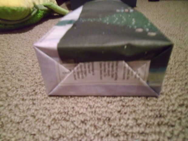 Tomar la aleta que está en el suelo y doblar contra el regalo (la imagen muestra cómo hacer esto).  Cinta de la parte superior del "triángulo".  Repita los pasos 2-4 en el otro lado.  Entonces usted es hecho! :)
