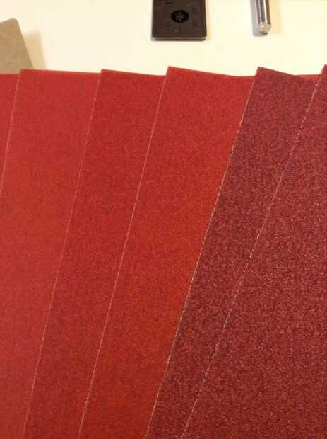 -Papel de lija: papel de lija más que usted compra estos días será en fichas de 9 x 11 pulgadas. Los colores que vas a ver la mayoría son rojo, verde y amarillo. Algunos metales y papeles de piedra están en gris a negro espectro. También encontrarás diferentes granos de lija y es divertido de jugar con el color y las texturas de los diferentes granos. Lo que utilizas depende de usted. Estoy usando un combo de 60, 80 y 120 granos, todos de color rojos.