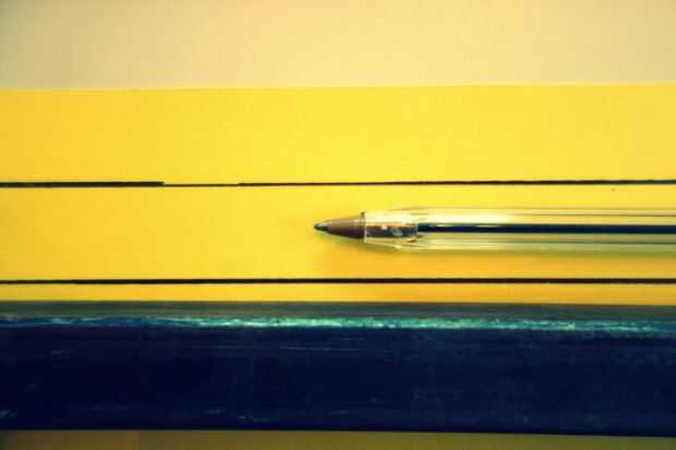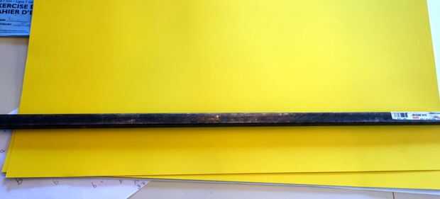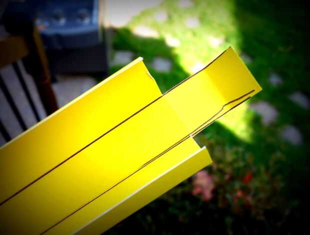 Sostenga el tubo en el borde de la tarjeta de papel y rodar 5 veces. Dibujar una línea a lo largo de este borde y corte. Repetir una vez más. Estas tiras se utiliza para envolver los tubos de acero. Anotar la tarjeta de papel con un bolígrafo antes de doblar ayuda a guiar los pliegues y hacer un acabado más limpio. Ver las fotos para entender cómo terminar los extremos. Luego tuve una serie de manos extras para mantener el papel de la tarjeta apretada alrededor de la barra mientras apliqué algunas cintas de embalaje transparente.