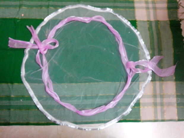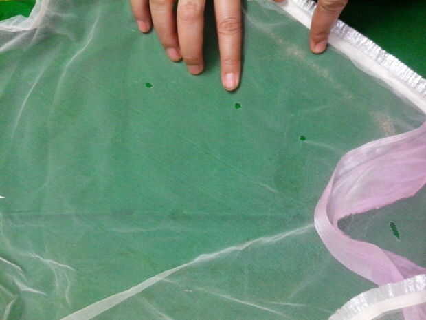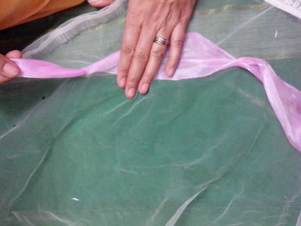 Ahora toma la cinta y empezar a poner en el primer hoyo y después que cada agujero suplente hasta completar un círculo.