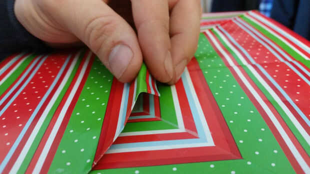 Lo que he encontrado para trabajar mejor es continuar con el doblez para que coincida con el método que hemos utilizado a lo largo. Tomar la punta de la aleta y dóblalo para que lo que queda se mezcla en el papel se pone encima. Esto toma mucho menos de ensayo y error. Y es también el punto donde es más evidente el cuadro qué tan cierto es, y lo bien ha alineado todo. Una vez que todo alinearon aplicar la última pieza de la cinta para terminar el lado.