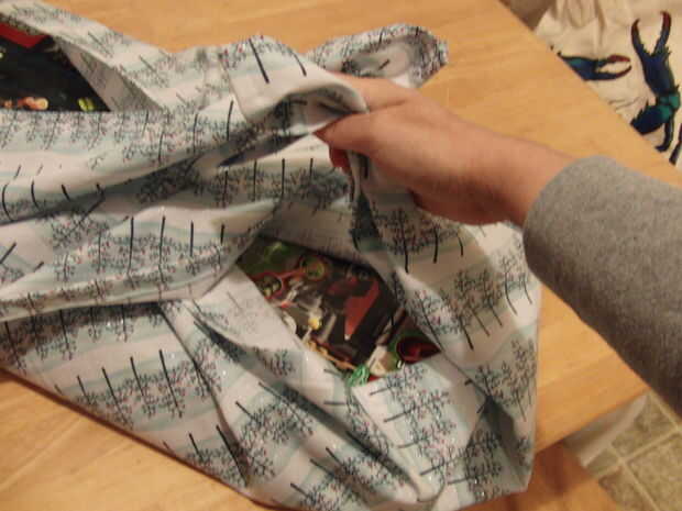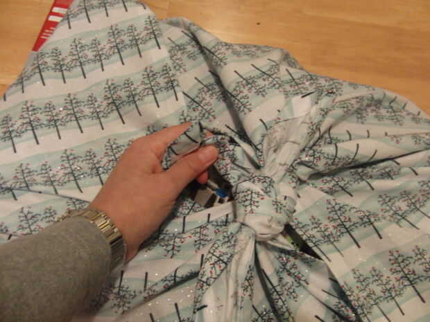 Traer las esquinas hacia el centro a lo largo del lado largo de la caja y atarlos.