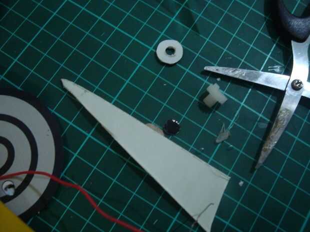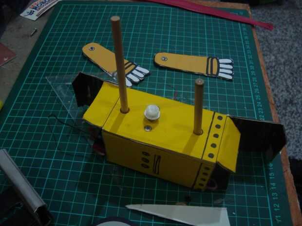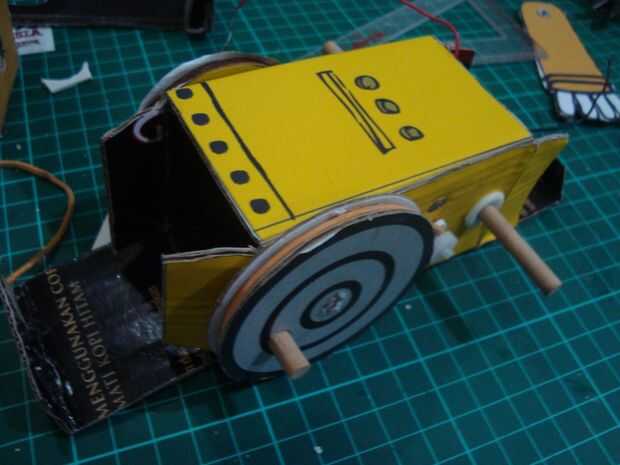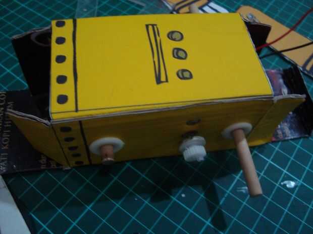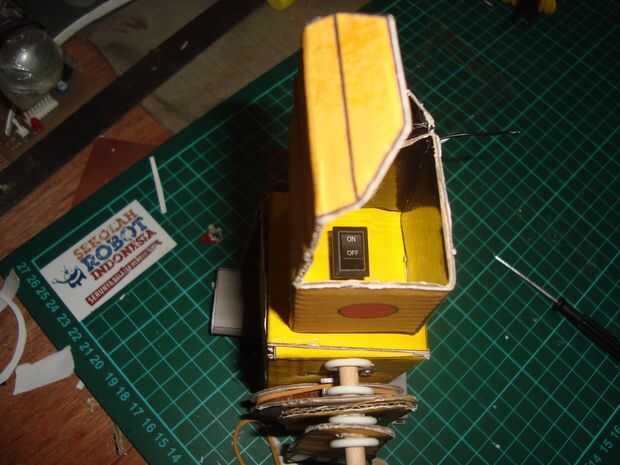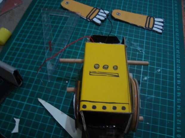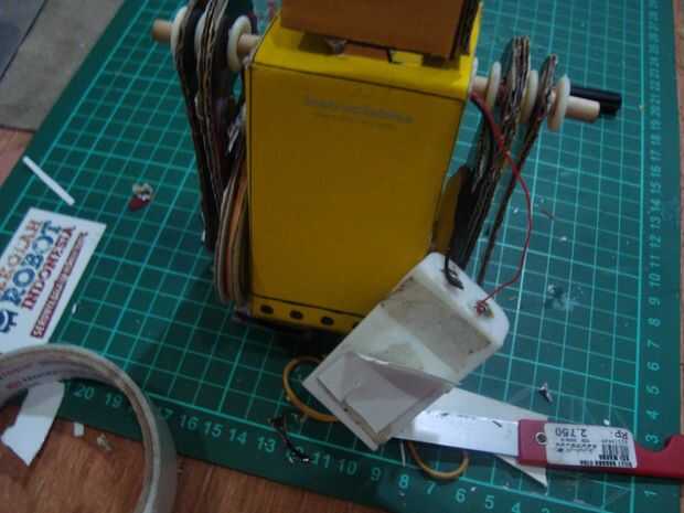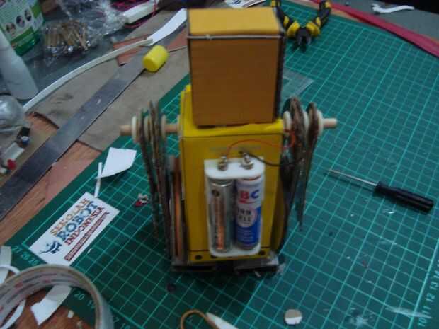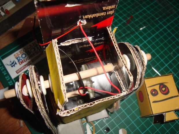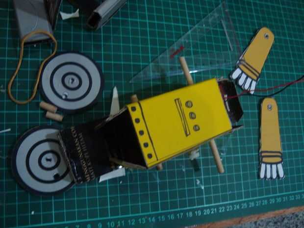 cortar los palillos 12cmm, 10 cm y 2 piezas de 2 cm. tamaño 12 cm los palillos para pinchar un agujero en la parte superior cuerpo y 10 cm en la parte inferior del cuerpo agujero. colocar las ruedas en la parte inferior de los palillos a cada lado de la rueda, que consiste en tres capas de cardboar en pares a cada lado del motor existente. poner una banda de caucho en la rueda de catrol Julio motor y rueda del robot. Ponga que un trozo de 2 cm de los palillos en el hueco de la rueda está en el lado de la rueda. (mirar la imagen)