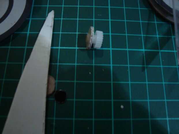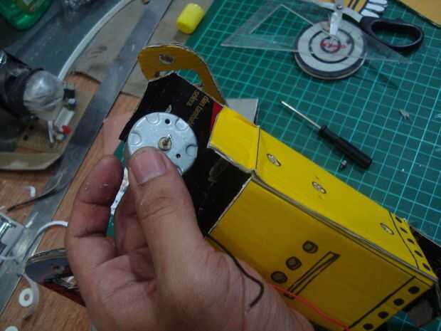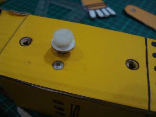 Enchufe el motor de la c.c. en un cuadro del cuerpo robot julio de entrada en los orificios existentes ver fotos, sostenga con screw.prepare una marcha anterior del pequeño juguete puede ser montada en el motor, hacer una pequeña placa de anillo julio de plastis (utilicé una tubería de agua de pvc) tapón en la rueda de engranaje formando pequeños catrol, poner en el motor julio.