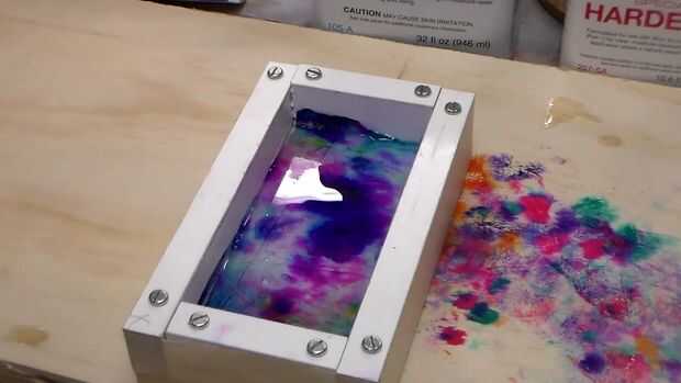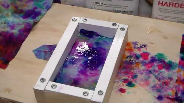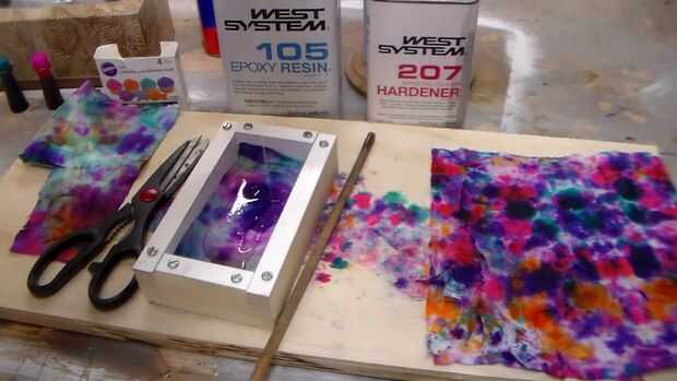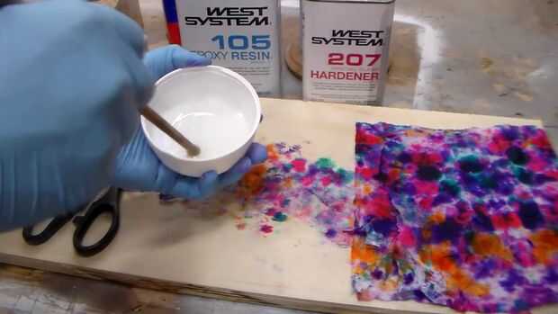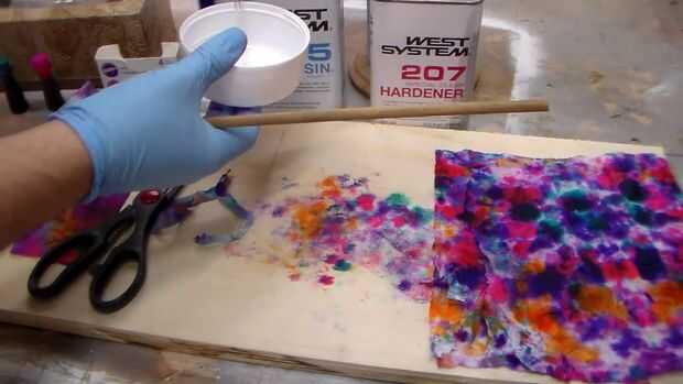 La resina de epoxy utilizada aquí es oeste sistema 105 resina con el endurecedor (claro) 207. No tarda mucho para poner una pequeña capa sobre el papel. Una vez vertido tendrá algunas burbujas en la resina que necesita al pop. Aplicar un poco de calor con una pistola de calor hará el truco.