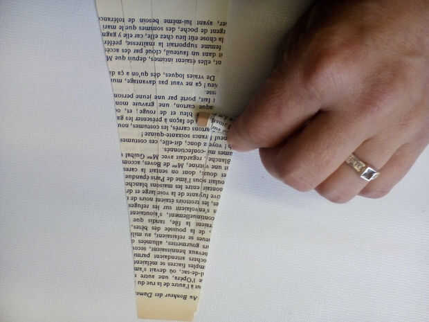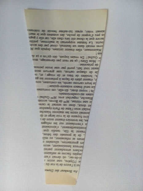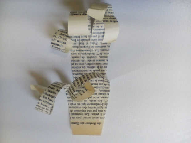 Para crear la cola, tomar dos hojas de papel de libro y cortar una forma del ventilador como se muestra. Cortar en una franja de ancho tiras, todavía Unidos por el extremo estrecho. Ruede cada fronda alrededor de un lápiz para crear las plumas de la cola. Una vez que ha hecho esto con cada fronda, pegamento o grapa las dos hojas a un extremo del cuerpo.