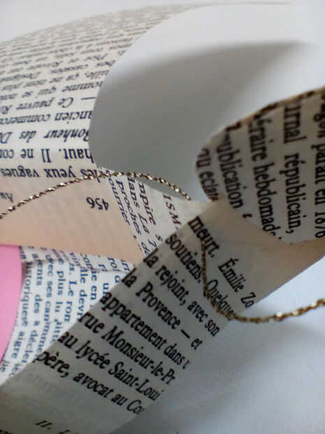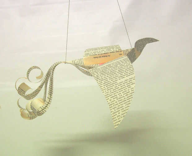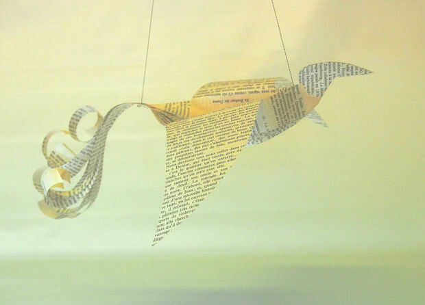 Coser un extremo del hilo para el cuerpo justo detrás de la cabeza y el otro a donde se superponen el cuerpo y la cola. Colgar en el lugar de su elección y disfrute de su pájaro de papel de libro!