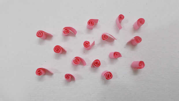 Corte una tira de color rosa en 16 partes iguales y hacer pequeños rollos sueltos con ellos para hacer el patrón de la colmena con ellos.