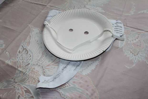 di vuelta a la máscara de la placa de papel al otro lado y hacer dos agujeros a cada lado con la punción. Luego adjuntas el pedazo de elástico en ambos orificios.