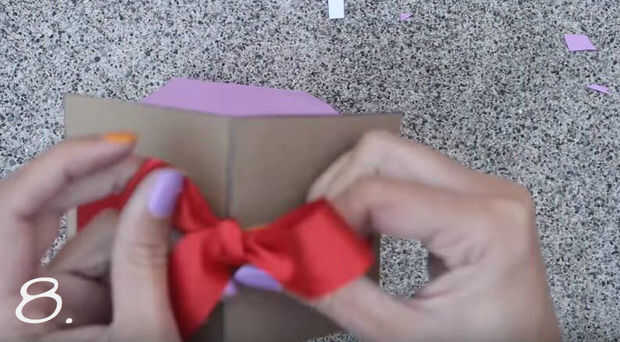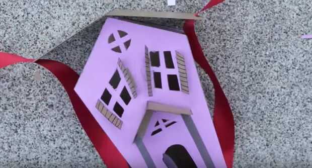 7. pase un pedazo largo de cinta a través de ambas ranuras en el techo. Este lugar alrededor de la casa y apriete la cinta.
