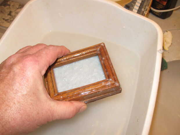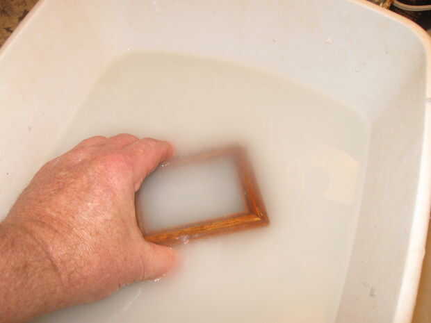 Añadir suavemente el deckle (marco superior, el lado plano hacia abajo) en la almohadilla de fregar cubiertos de tul.