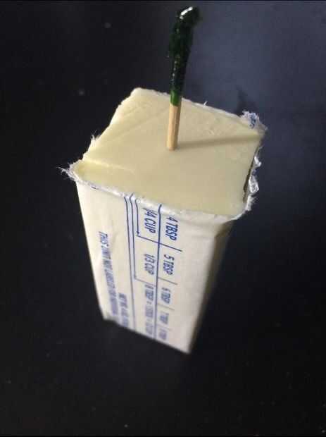 Después de cortar la mantequilla, coge el palillo y hágale un agujero en el centro de la mantequilla (como en la imagen.)