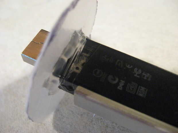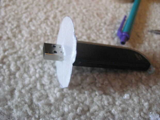 Tomar el otro círculo de papel y corte un orificio exactamente el tamaño de su conector USB y empujar a través de. Fuego pistola de pegamento caliente y asegurar la unidad en su lugar. Cinta en el rollo TP.