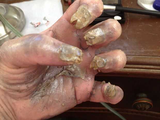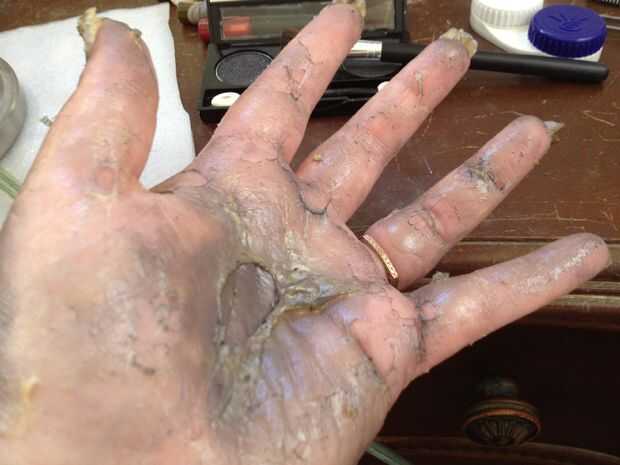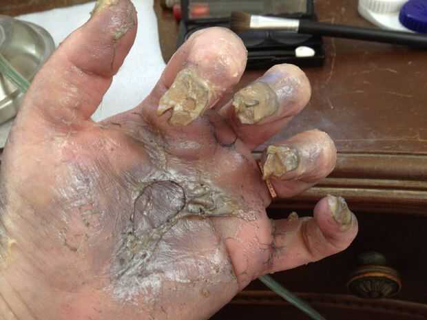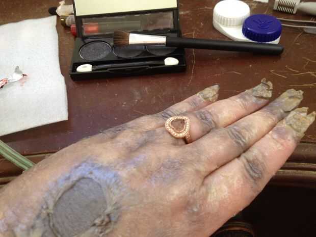 Para el maquillaje de la mano, asegúrese de que usted lleva la mirada hasta su brazo, lo que se muestra. No desea utilizar latex en el pelo, pero puede dab alguna sombra de ojos y hacer que frotar, como contusiones. Básicamente, el paso después de látex, sería la Fundación. Esto hará que un tono de piel uniforme. Una vez que se seca, añadir su sombreado y acentuar los bordes, hacer muerto!