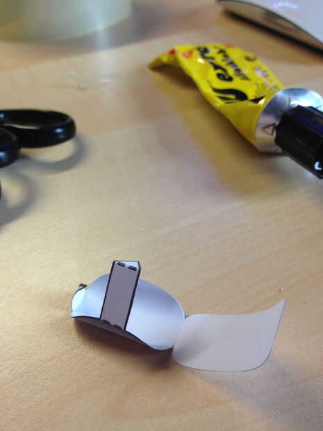 Entonces sólo plegar la parte blanca y pegamento en el puente y la solapa inferior.