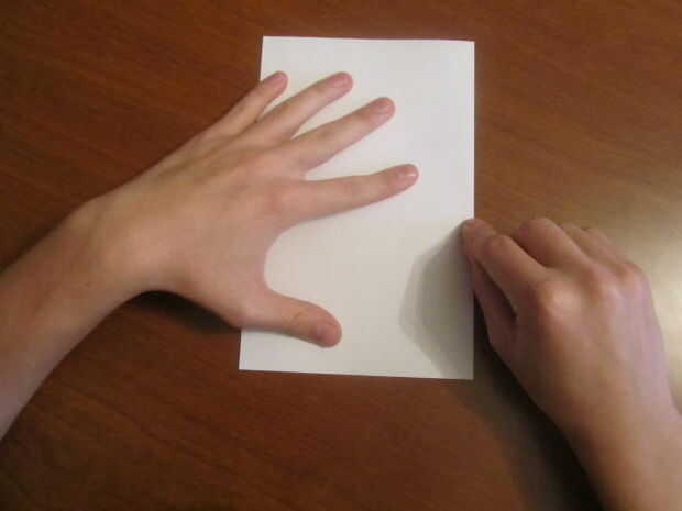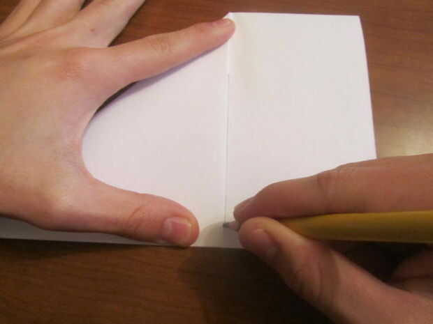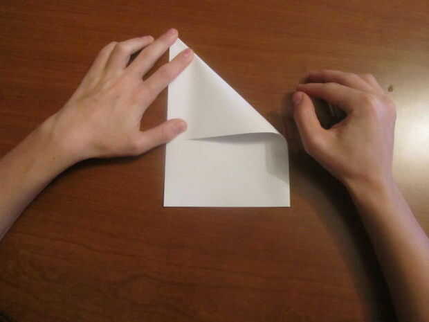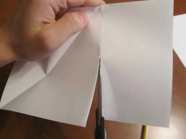 Primero usted necesita doblar el papel por la mitad verticalmente y hacer un pliegue bien bonito. Ahora dobla la esquina derecha a la izquierda. Trace una línea en el pliegue y corte en la línea.