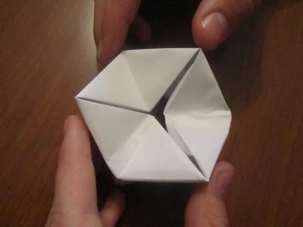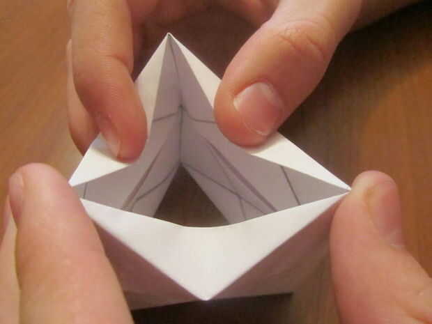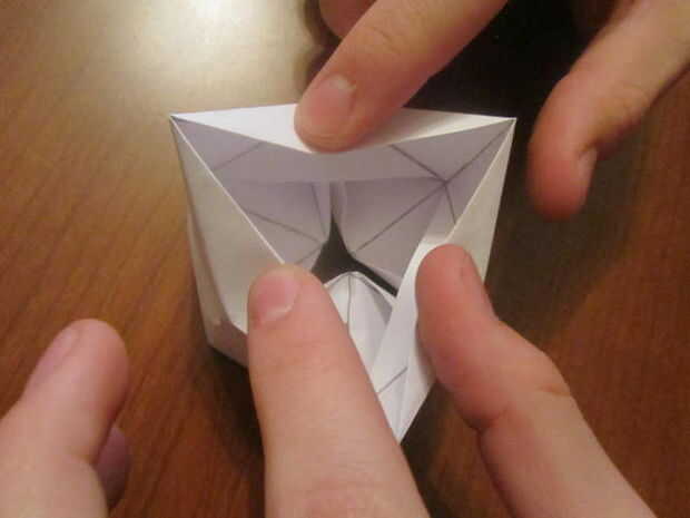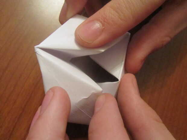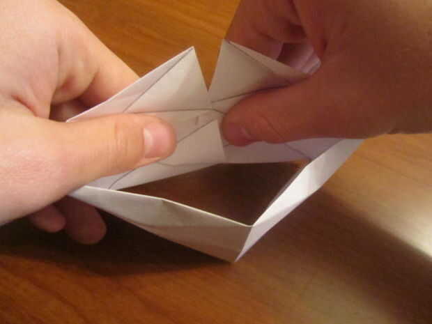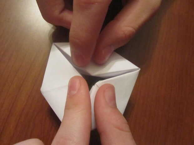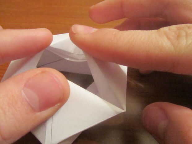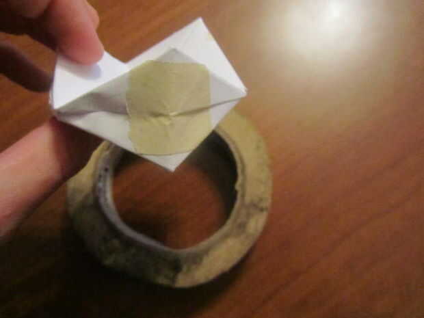 Inserte el papel en sí mismo y doble las aletas en el medio. Doblar las esquinas hacia el centro y hacer lo mismo para el otro lado también. Ahora la cinta el lado doblado y VOILA listo ahora con lo de papel invirtiendo (no sé su nombre real)