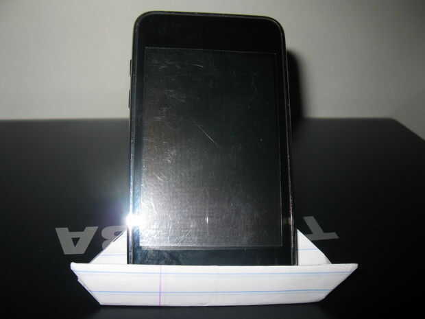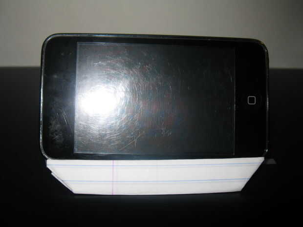 fácil para ipod / iPhone soporte que funciona en la vista vertical u horizontal. Lo mejor de todo, usted puede hacer de cualquier pedazo de papel de cuaderno.