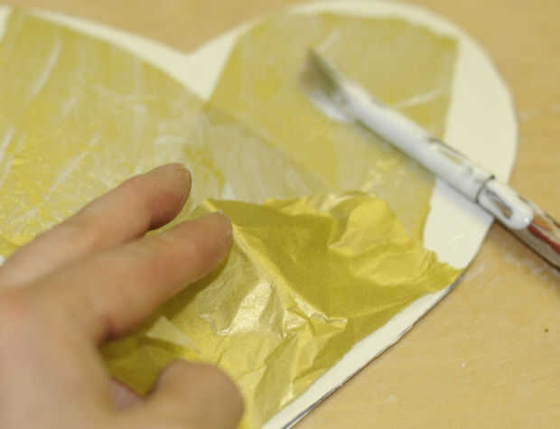 Pegue los dos corazones juntos para alas más rígidas. Cepillo Mod Podge en el frente de las alas y empezar y arrancado pedazos de papel de seda de oro.