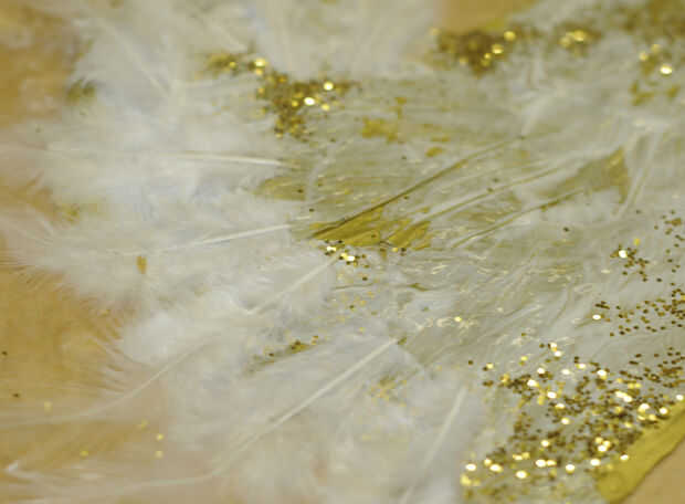 Cepillo Mod Podge sobre cada capa. Alrededor del borde de las alas, empezar a añadir pequeñas plumas blancas. Usé glitter Oro para añadir interés.