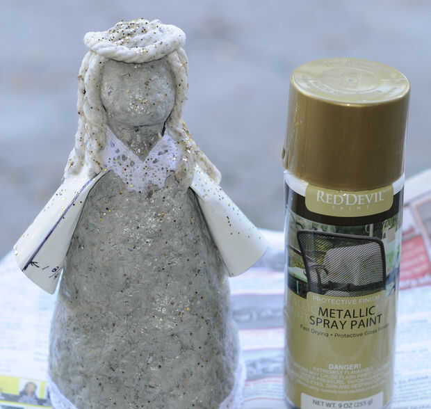 Una vez seco, voltee las alas y hacer lo mismo en la parte posterior de las alas. Rocíe al ángel con una capa de pintura de aerosol metálica oro.