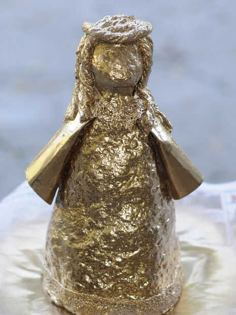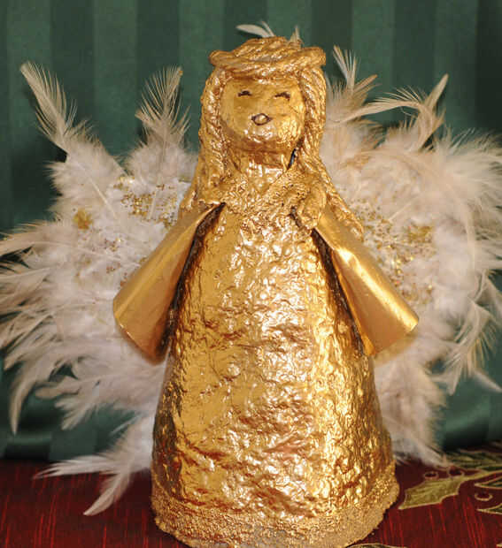 Pegar las alas a la espalda del ángel. Con un rotulador permanente, dibuja pequeños ojos y una boca redonda cantando villancicos. (opcional)