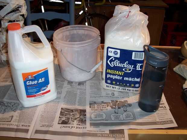 2. cosas para hacer pegamento de papel maché. Este proyecto utiliza extra duro papel maché con los siguientes materiales: pegamento de resina de plástico de 1/2 taza, blanco 1 taza de harina, 4 tazas de agua.