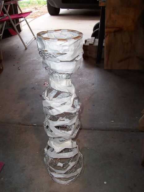 Cortar un círculo de cartón del tamaño de la abertura en la parte superior del marco para establecer la forma básica de la superficie de montaje de la cabeza del tambor. Utilice cinta adhesiva para unir todo y hacer algo para el papel maché agarrar a en ambos las aberturas superior e inferior (Figura 5).