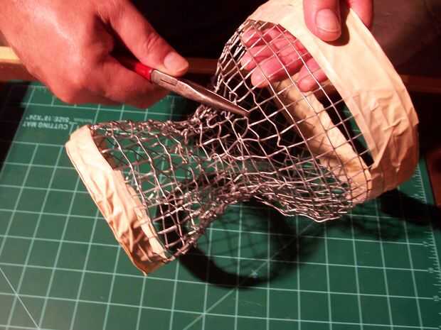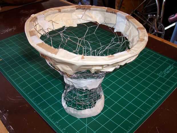 Un segundo instrumento más inusual fue hecho usando alambre de pollo para el marco (Figura 6), alambre de pollo es mucho más fácil de trabajar pero no ofrece tanto soporte como paño del hardware. Esto puede conducir a la flacidez cuando se aplica la maché de papel pesado y húmedo, pero pueden ser tratado con.