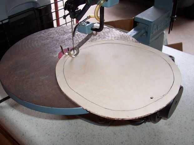 Traza la forma de la parte superior en un pedazo de madera contrachapada y cortar hacia fuera en una sierra de banda (o cualquier otro tipo de Sierra tiene que funcionará). Ahora tienes una pieza circular de madera.