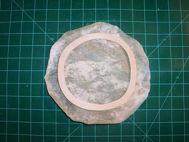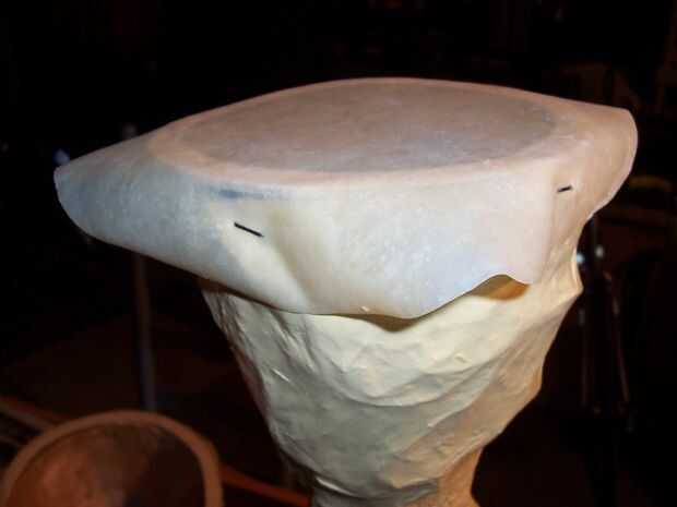 Coloque la piel de cabra húmeda sobre el anillo y doble más un lado contra la shell. Clavar una grapa con una pistola de grapas para sujetar en su lugar.
