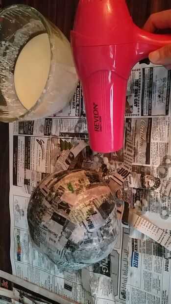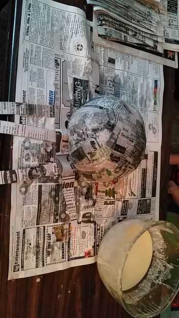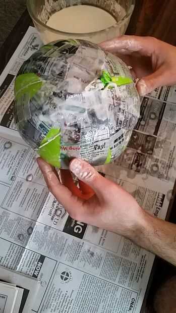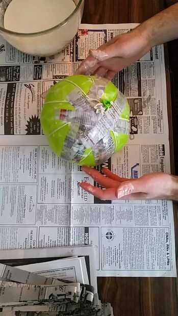 Primero se corta las tiras de periódico de aproximadamente 1 o 2 pulgadas de ancho. Sumergir el papel en el goo de harina, squeege exceso de líquido y golpear sobre el balón. Si ha mojado demasiado te puede tener que esperar hasta que esté seca para hacer más capas (1-2 días) necesita unas 4 capas, lo suficiente como para que sea duro. Traté de acelerar el proceso con un secador de pelo y que no funcionó bien.