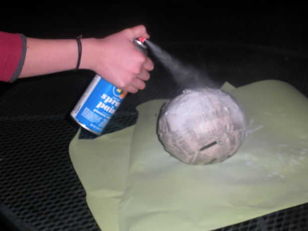 Después de seco el papel maché, pintura de aerosol de su globo blanco. Permite una capa de base para pintar su globo.