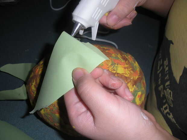 Usar una pistola de pegamento caliente para unir hojas de papel piña.