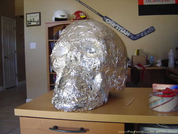 Cubre el cráneo en papel de aluminio, cinta adhesiva los bordes con cinta de embalaje y alisar todo el asunto con un popsicle stick. trabajé sólo con la mitad frontal del cráneo para esta parte del proyecto se realizará en dos etapas de ahora.